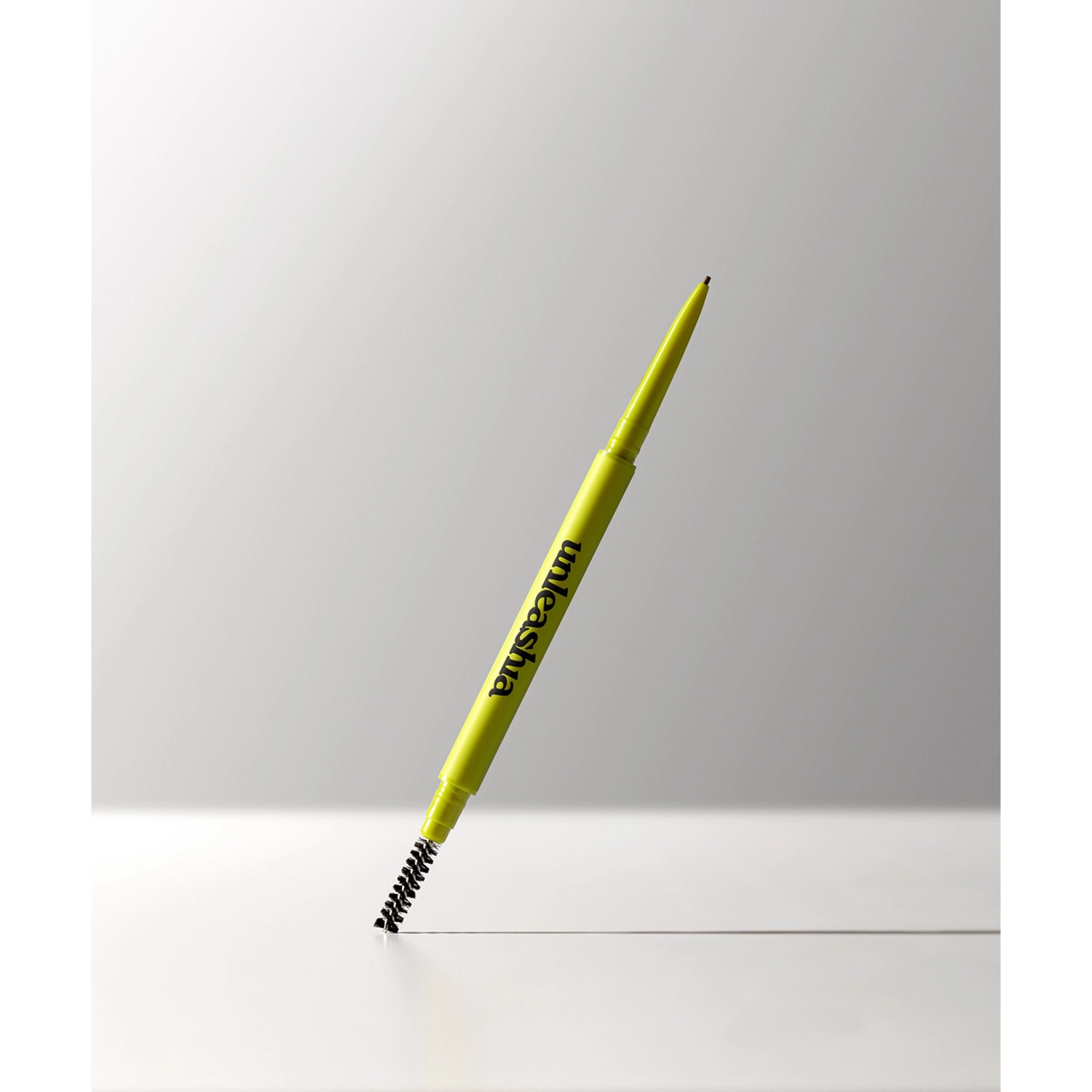 Unleashia - Shaper Defining Eyebrow Pencil - tužka na obočí v tmavě šedém odstínu. Má krémové složení a poskytuje výrazný, ale přirozený efekt. Je odolná vůči otěru a rozmazání. Byla obohacena o tea tree olej (z čajovníku) a kyselinu hyaluronovou, které udržují chloupky v obočí v dobrém stavu. Precizní hrot umožňuje vykreslit jemné chloupky a přiložený kartáček umožňuje vyčesat obočí do požadovaného tvaru. Veganský produkt.