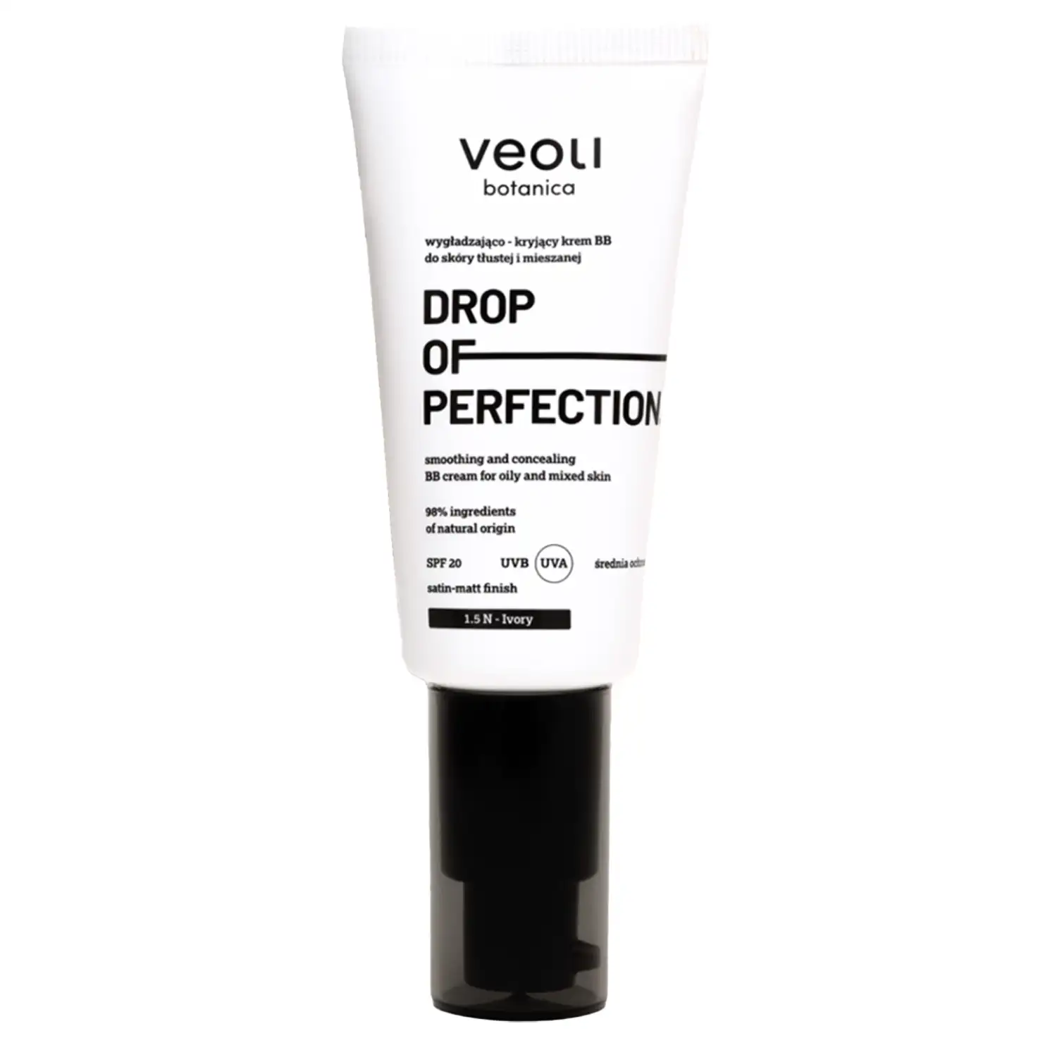 Veoli Botanica - Drop Of Perfection - BB krém s velmi lehkou konzistencí a saténovým, dlouhotrvajícím finishem, který díky obsahu složek rostlinného původu navíc vyhlazuje a chrání před působením volných radikálů. Obsahuje komplex cyklopeptidů Poretect™, který zlepšuje elasticitu pleti, stahuje rozšířené póry a zanechává pleť zdravější na pohled, hyaluronát sodný, který váže vodu v pokožce a zvyšuje úroveň hydratace a Phytessence™ Blue Daisy, fyto aktivní extrakt z „modré sedmikrásky“ (Globularia Alypum), který má protizánětlivé vlastnosti a zklidňuje citlivou a podrážděnou pokožku. Přípravek byl dále obohacen také o extrakt z listů koulenky keříčkové (Globularia Alypum), který zklidňuje a zpomaluje proces stárnutí. BB krém obsahuje minerální filtr (SPF 20), který chrání před slunečním zářením. Produkt je bez parfemace, je možné ho vrstvit a je vhodný také pro citlivou pleť.